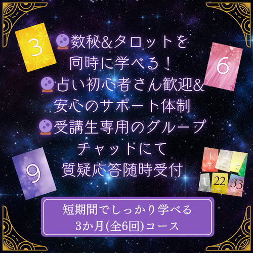 3ヶ月間(全6回)の連続講座を通して、数秘術とタロットの基礎的な知識&スキルを学び、実践でも活かしていけるよう【気づき】を重視していけたらと思います。